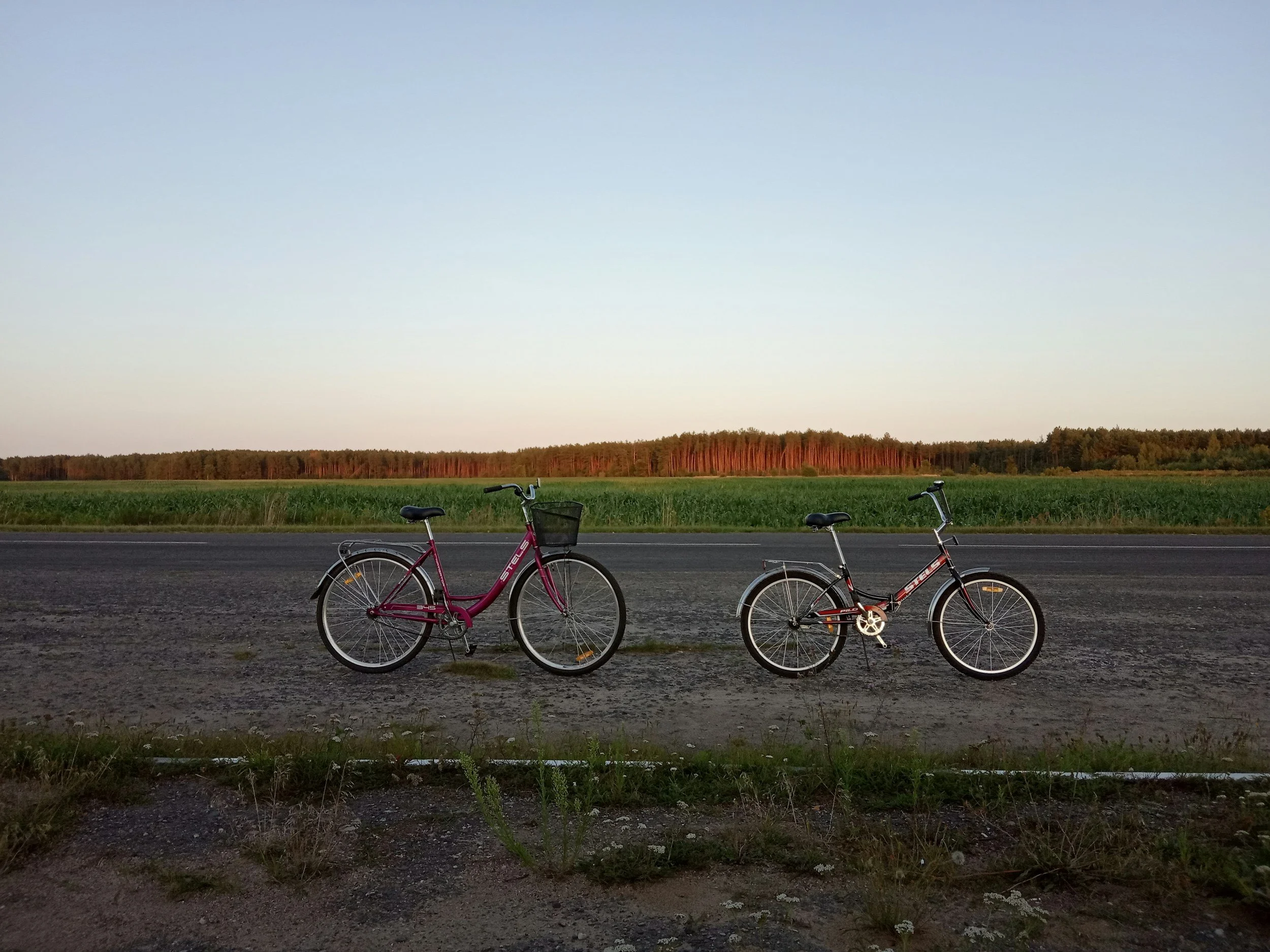 red bicycle and black bicycle standing upright with green grass and a sunset in the background.