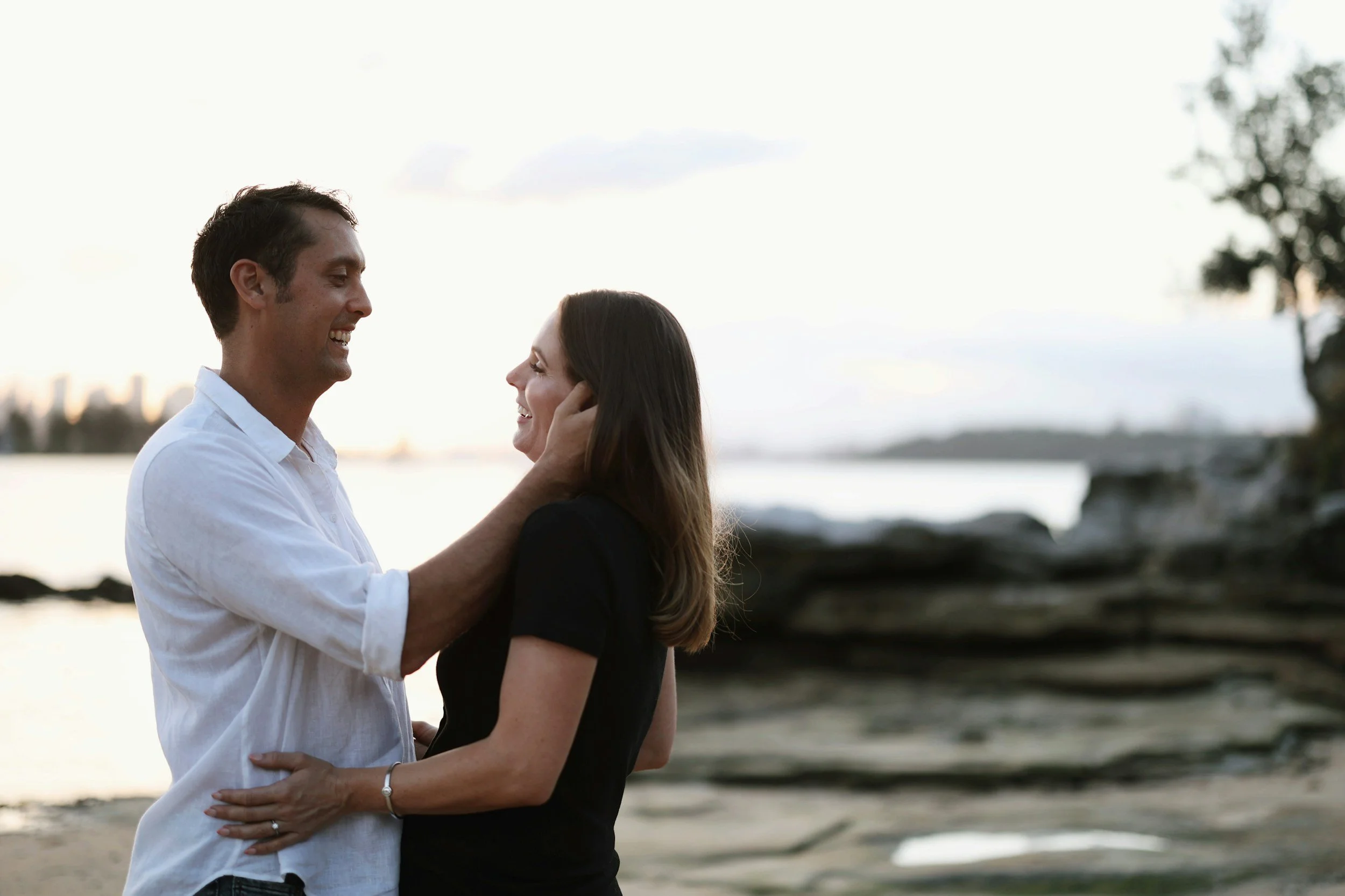 a couple embracing and smiling at one another with a lake in the background.